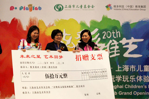 维多利亚(中国)教育集团热心公益,在这次活动中,向上海市儿童基金捐款50万元人民币,用作推广"未来之星,艺术圆梦"慈善项目。代表上海市儿童基金会发言的王禄宁副理事长感谢维多利亚的捐助,表示定按照维多利亚意愿,将捐款用于支持及推动沪港儿童文化艺术交流,增进沪港儿童友谊。王禄宁副理事长表示,维多利亚是上海早期教育的领跑者。这次艺术展暨玩学玩乐体验馆能引导上海家长、学校和社区思考如何构建和谐健康的亲子关系,如何引导青少年扣好人生第一粒扣子,亦能带领上海地区创造科学、友善、正能量、有助于儿童成长的环境。
